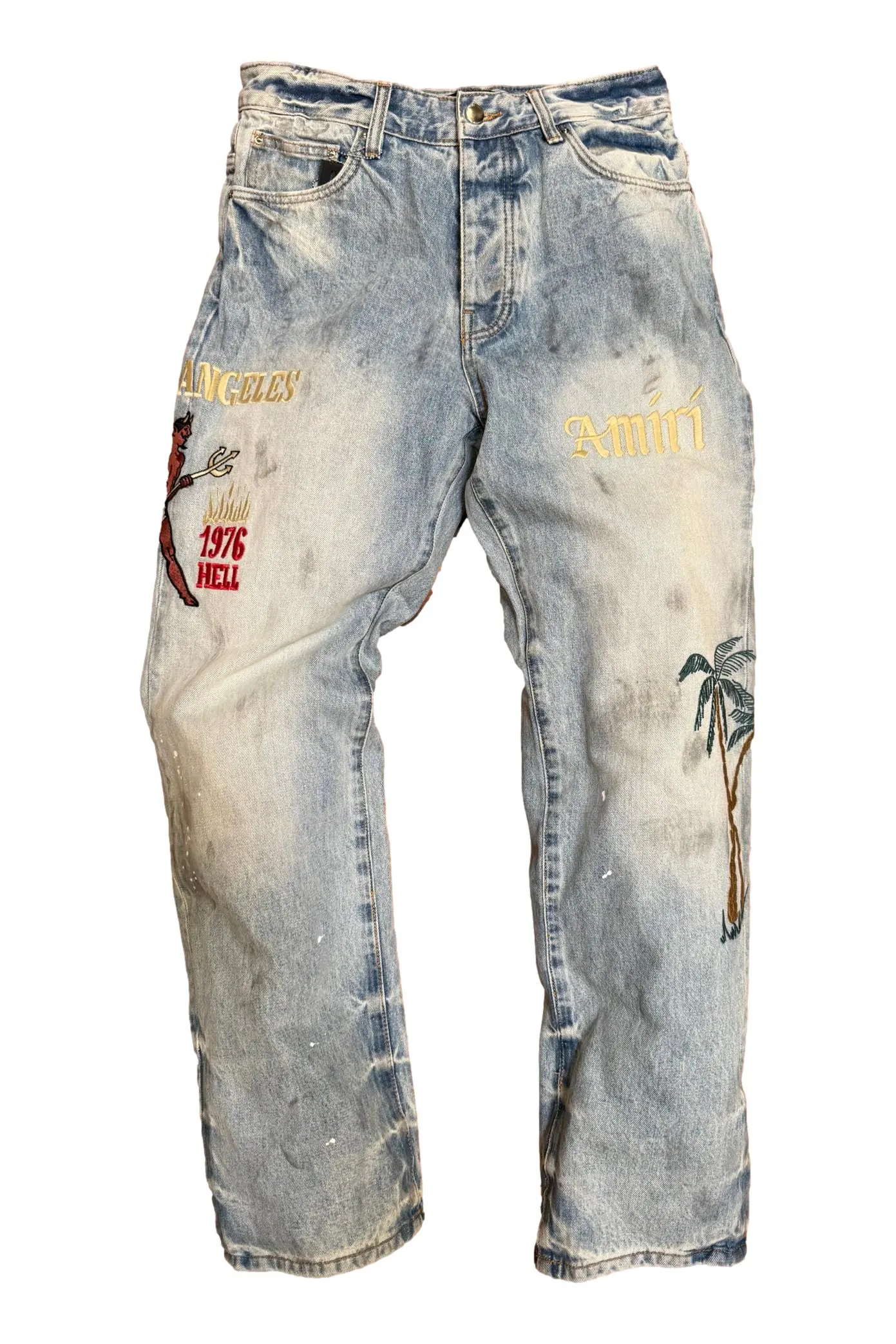 This AMIRI model features signature embroidered graphics and washed denim for a lived in effect. The loose silhouette offers comfort while giving the jeans a laid back California attitude. Ideal for those who want artistic and expressive denim with a relaxed fit.