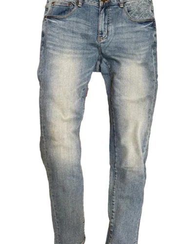 These AMIRI jeans come in a light blue wash with bold embroidered patches and a vintage inspired biker aesthetic. The distressed details and soft fading create an authentic worn look. A perfect statement piece for anyone who prefers relaxed premium denim.