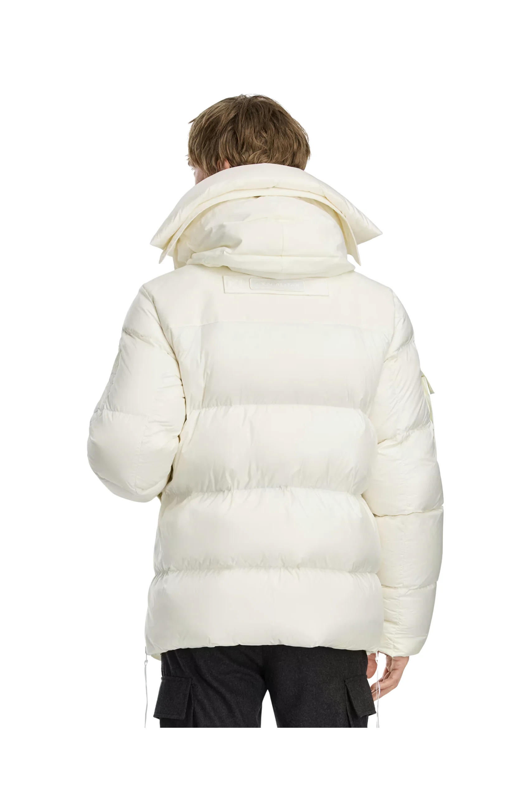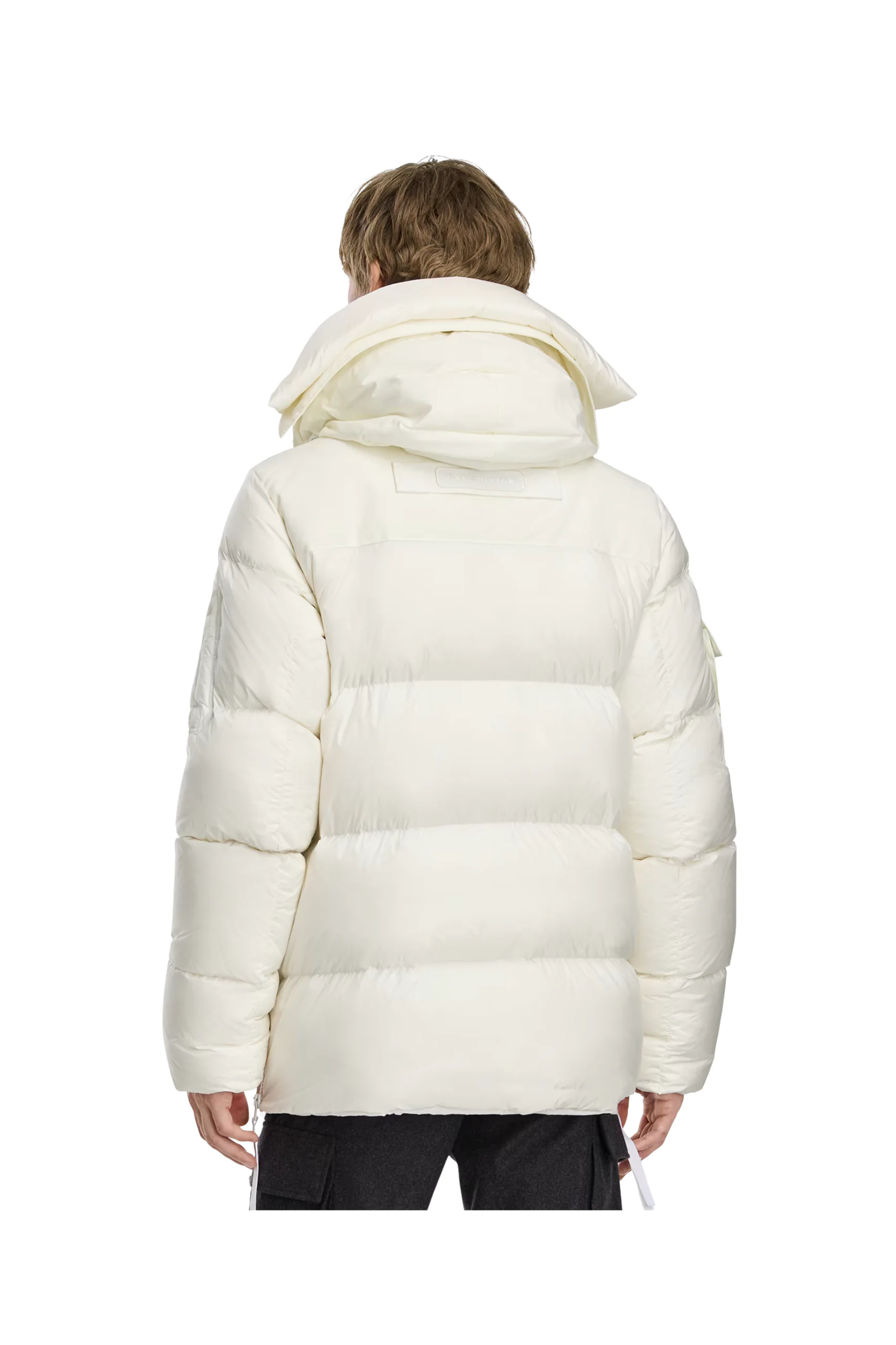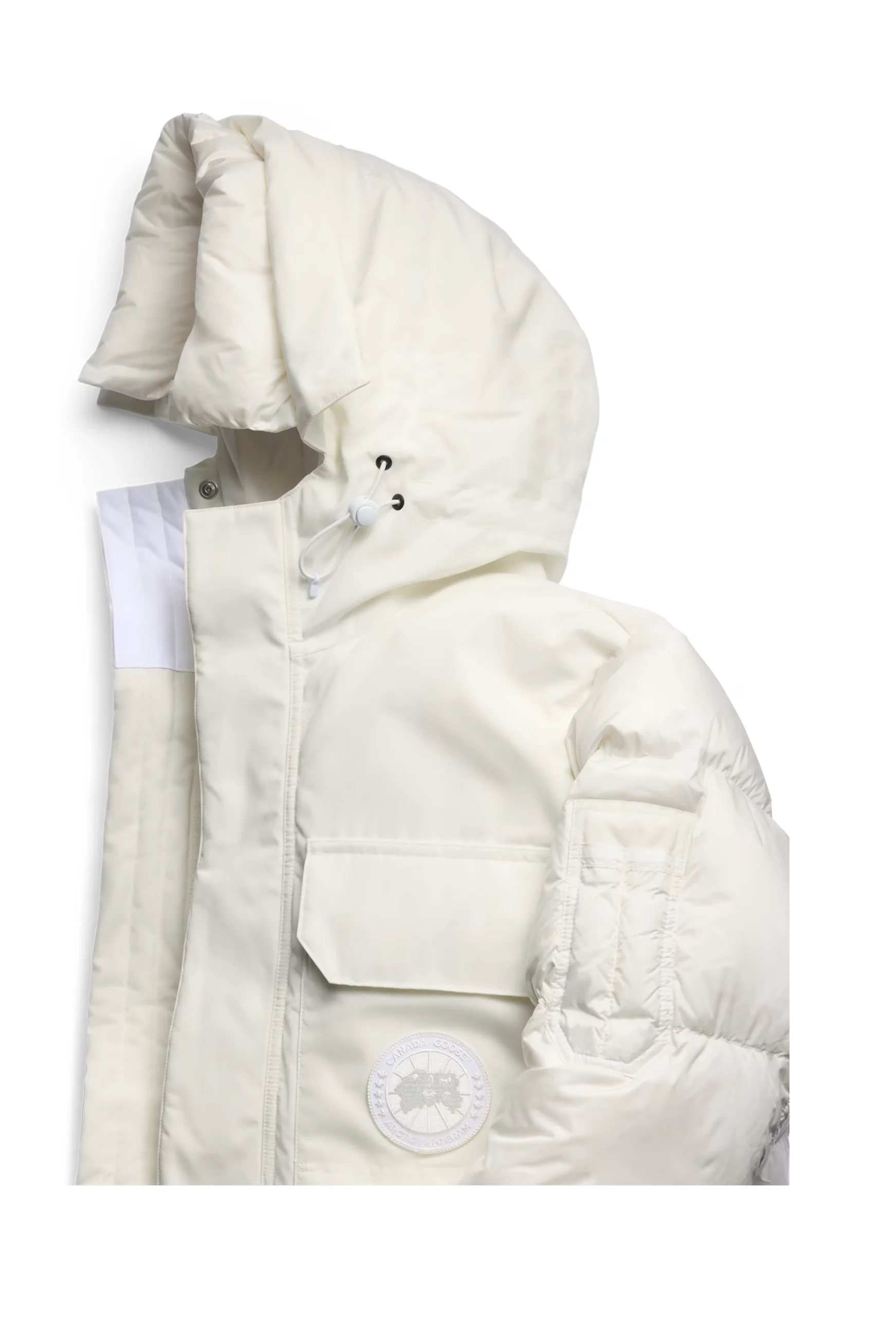 It features an adjustable down-filled hood with a removable brim for optimal protection on extreme days and an interior drawcord at the waist for a customized fit and added warmth.