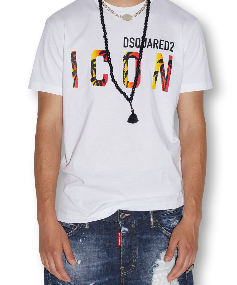 The Dsquared2 men's T-shirt is a must-have for any fashion-savvy guy. It features a vibrant graphic print of "ICON" and "DSQUARED2" set against a tropical motif. This unique t-shirt is perfect for adding a touch of personality to any outfit. Pair it with denim shorts and chunky sneakers for a skater-inspired look, and accessorize with a bead necklace for an added touch of cool.