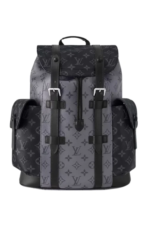 The Christopher PM backpack takes on a striking aspect in Monogram Eclipse Reverse canvas with black-leather trim. Two side pockets enable quick access to essentials while the leather flap with press-stud closure keep belongings safe. The Christopher PM is inspired by the design of the rugged hiking rucksack, rendered here in smaller dimensions.