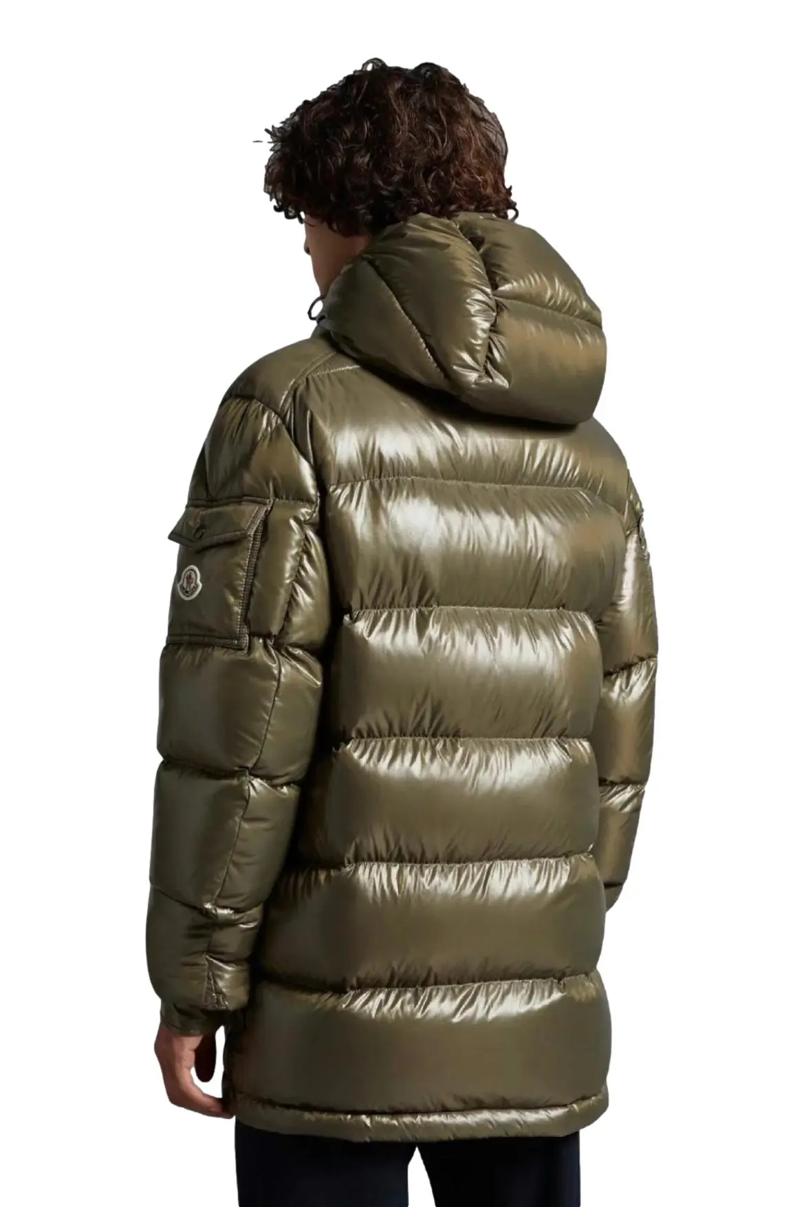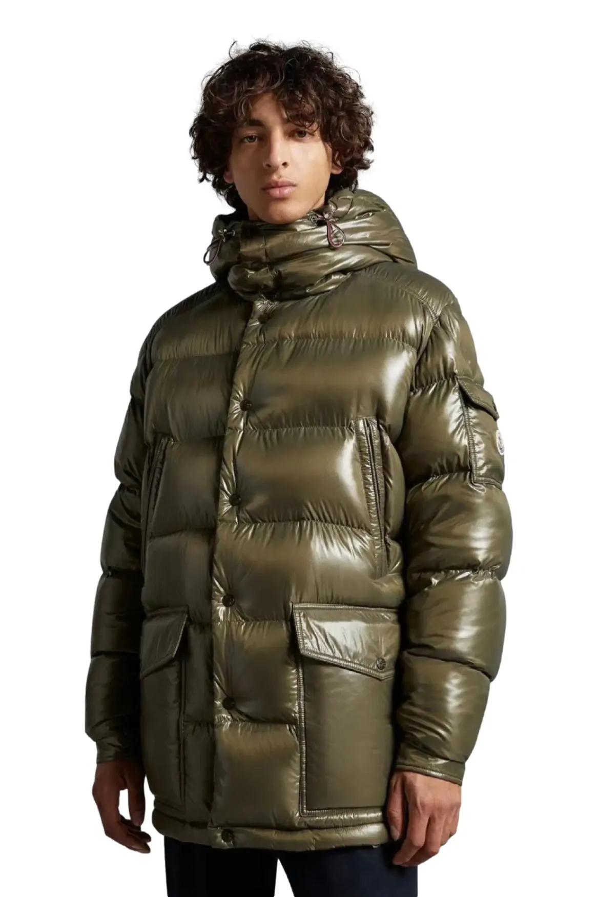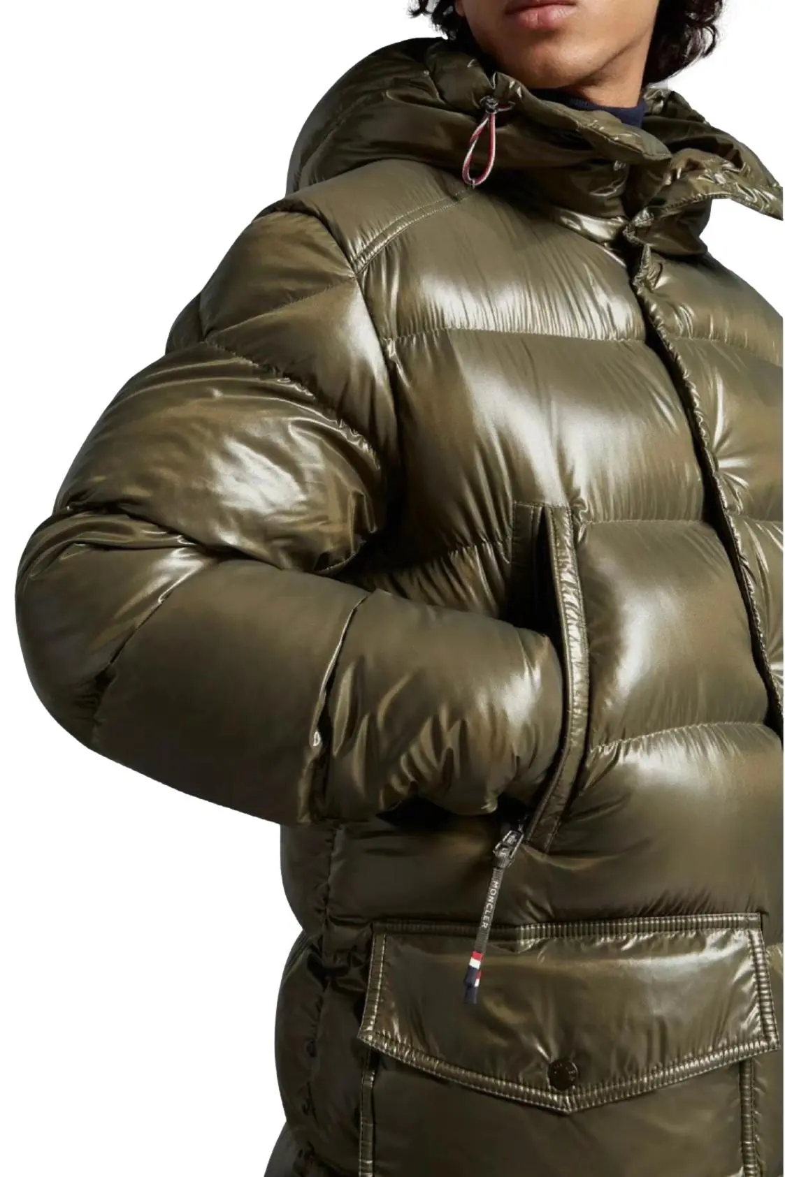 In line with the brand’s sustainability initiatives, the Chiablese down jacket is crafted from recycled nylon laqué. The hooded puffer has a distinct Moncler point of view, being embellished with discrete tricolour accents and an emblematic patch pocket on the sleeve.