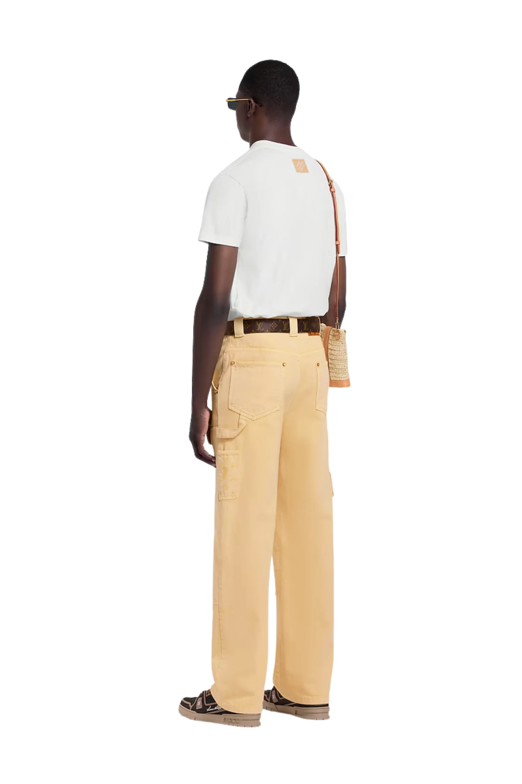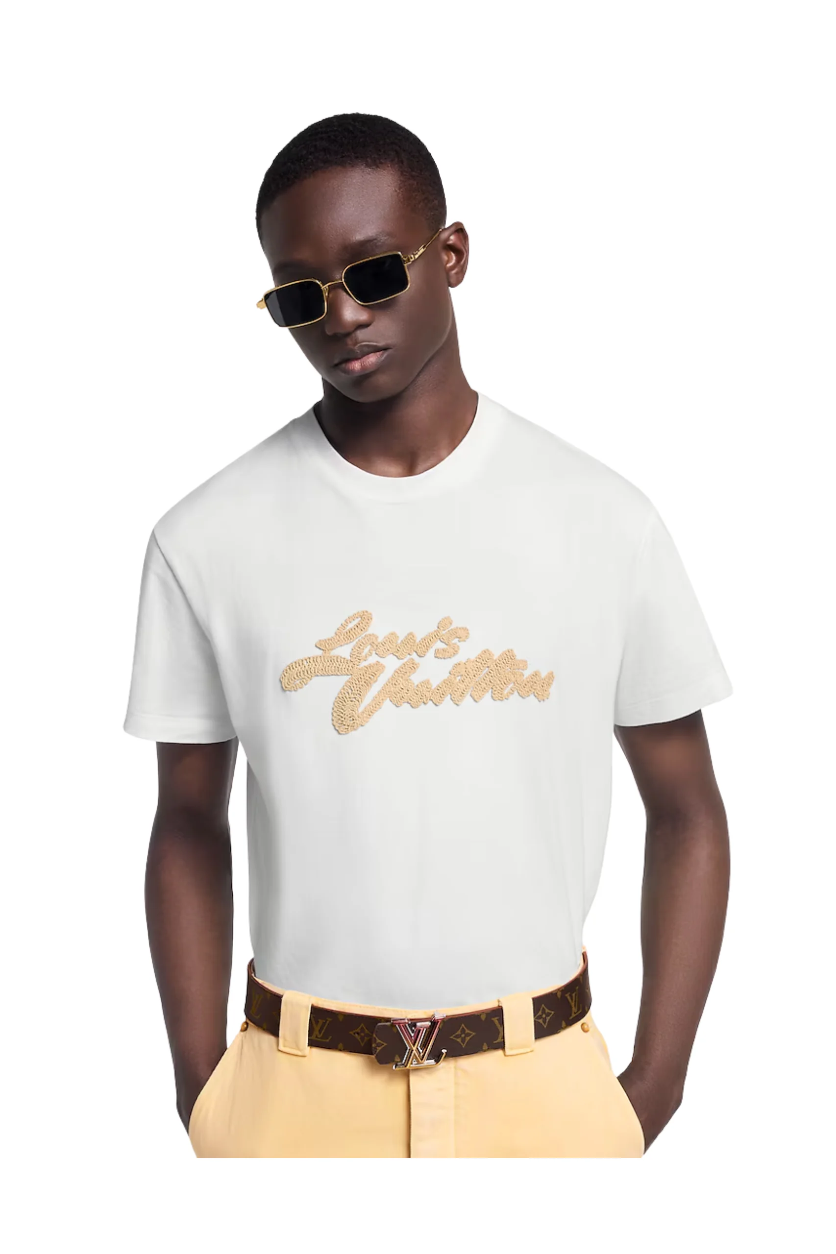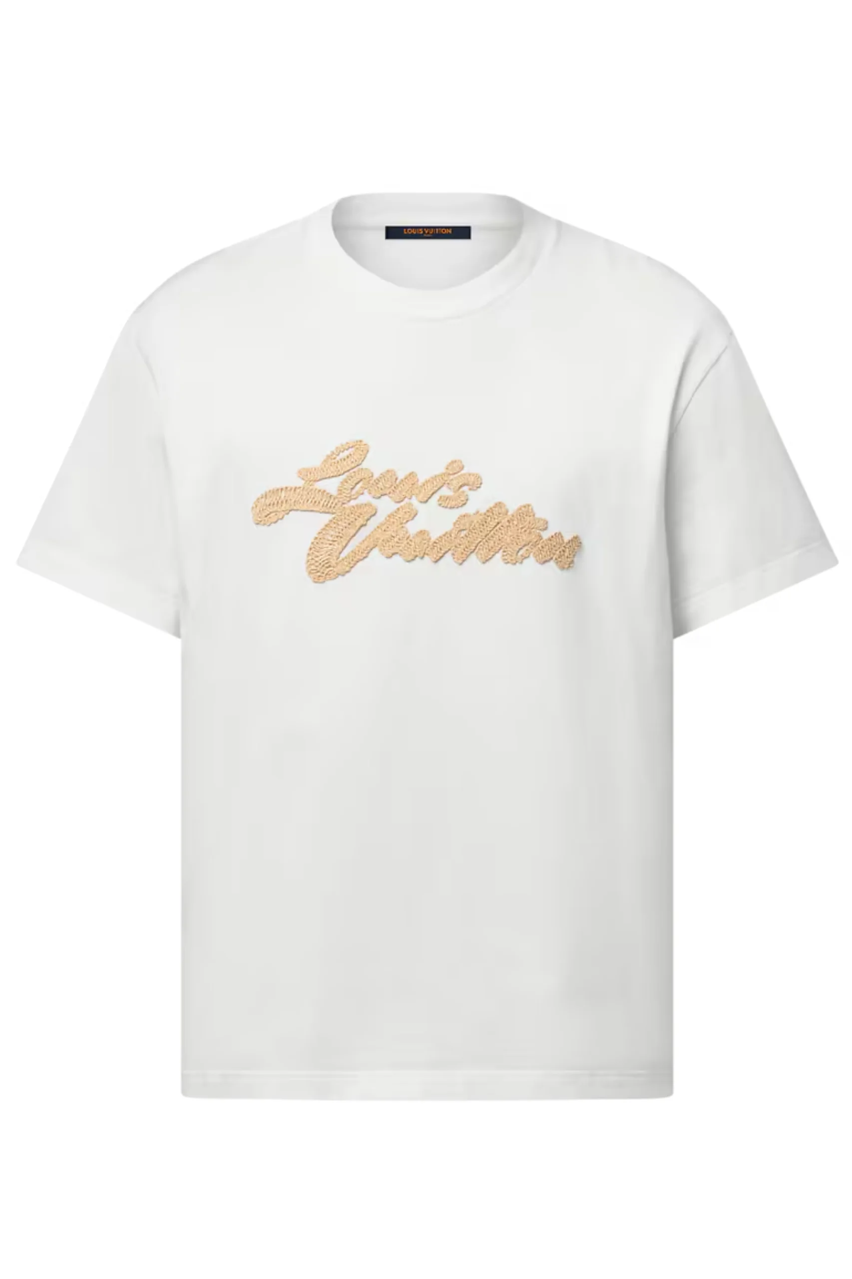 This breezy white T-shirt in light cotton jersey plays with raffia-like signatures lending an artisanal vibe to the timeless silhouette. An embroidered Louis Vuitton adorns the chest while a Marque L.Vuitton Déposée label signs the back. This versatile piece is easy to mix and match with casual summery looks.