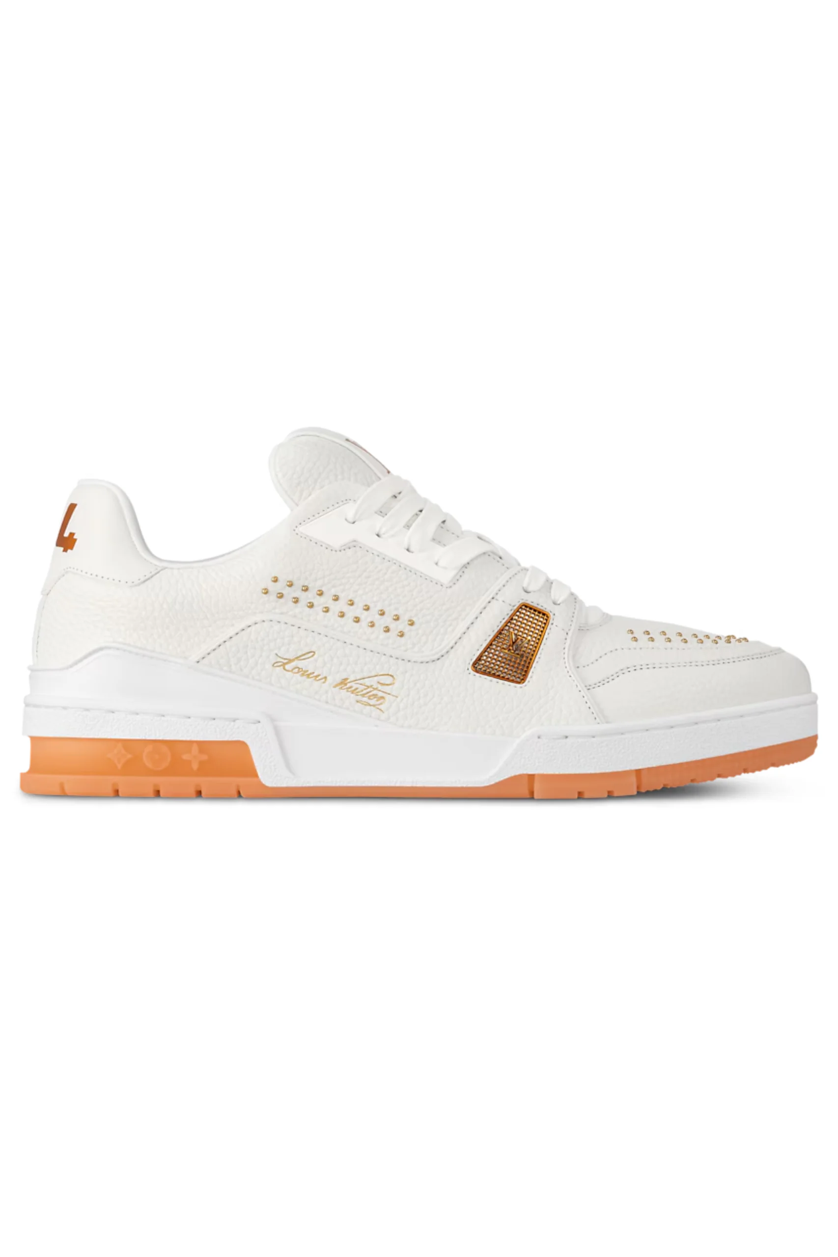 In this interpretation, the LV Trainer sneaker is presented in grained calfskin leather with colorful metal elements, including an LV initial detail. This iconic shoe was originally designed by Virgil Abloh. A Louis Vuitton signature in script accentuates the side, while monogram flowers adorn the two-tone rubber outsole.