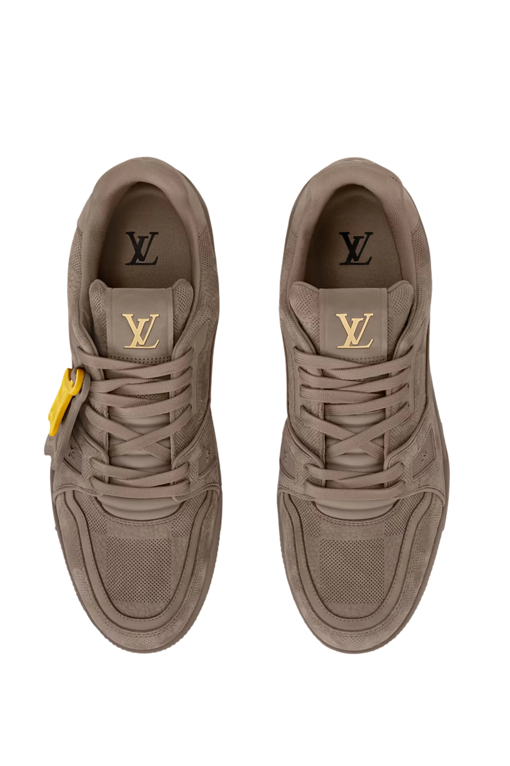 The LV Trainer sneaker is reinterpreted in nubuck calf leather embossed with the Damier pattern.
