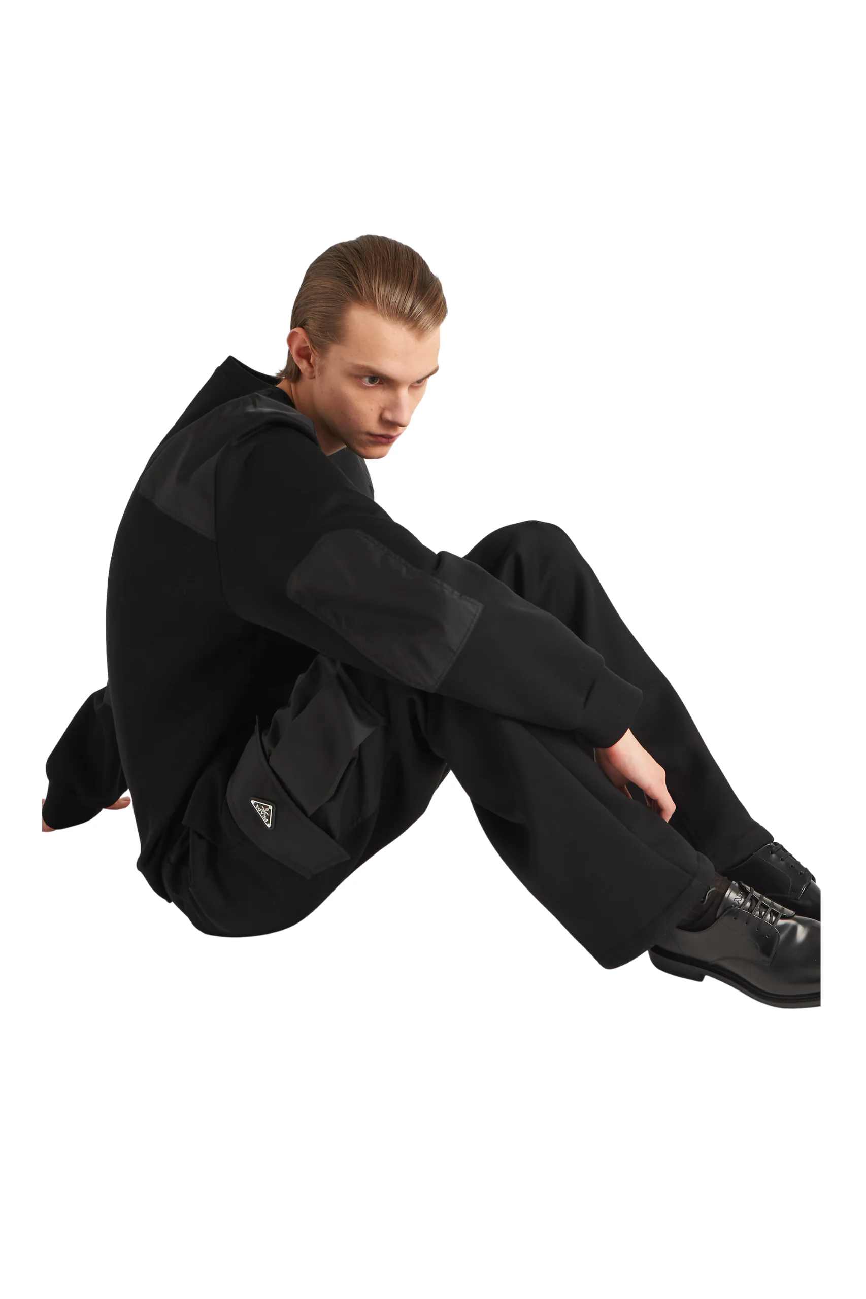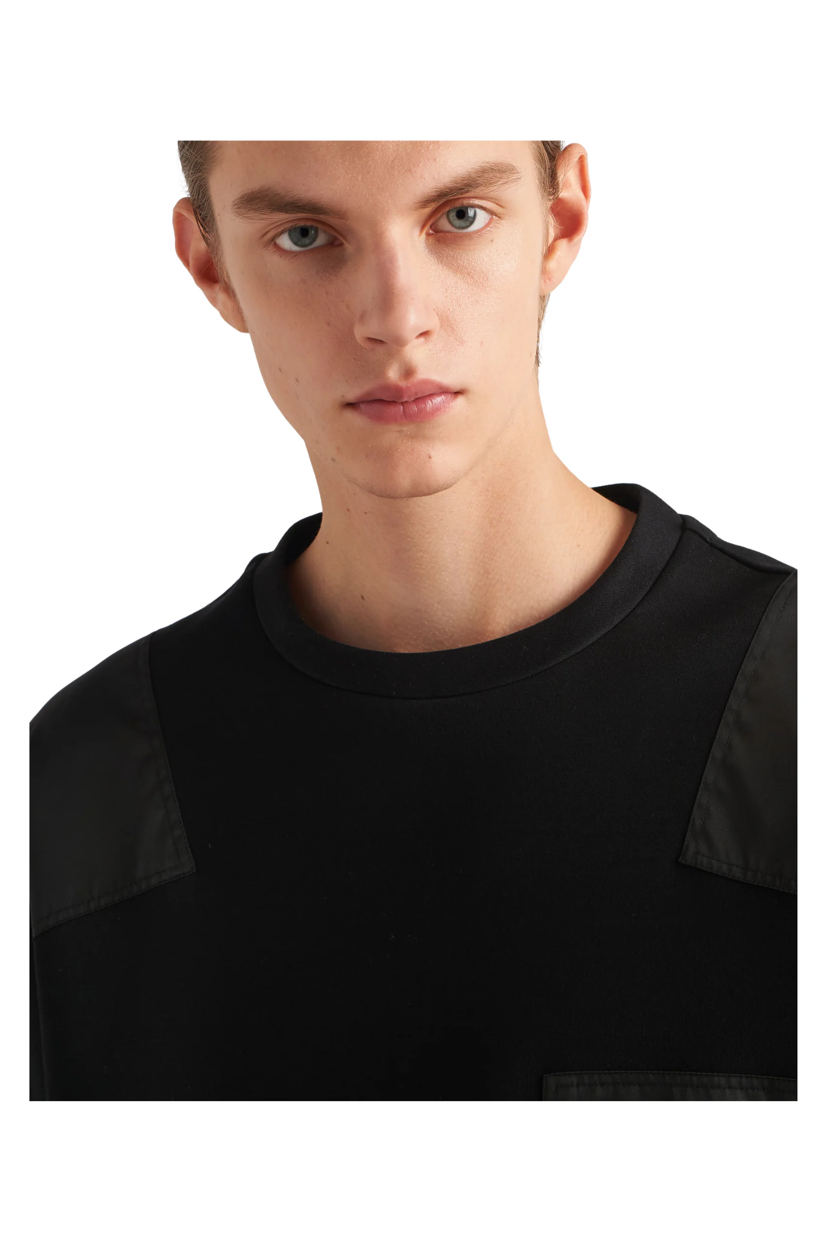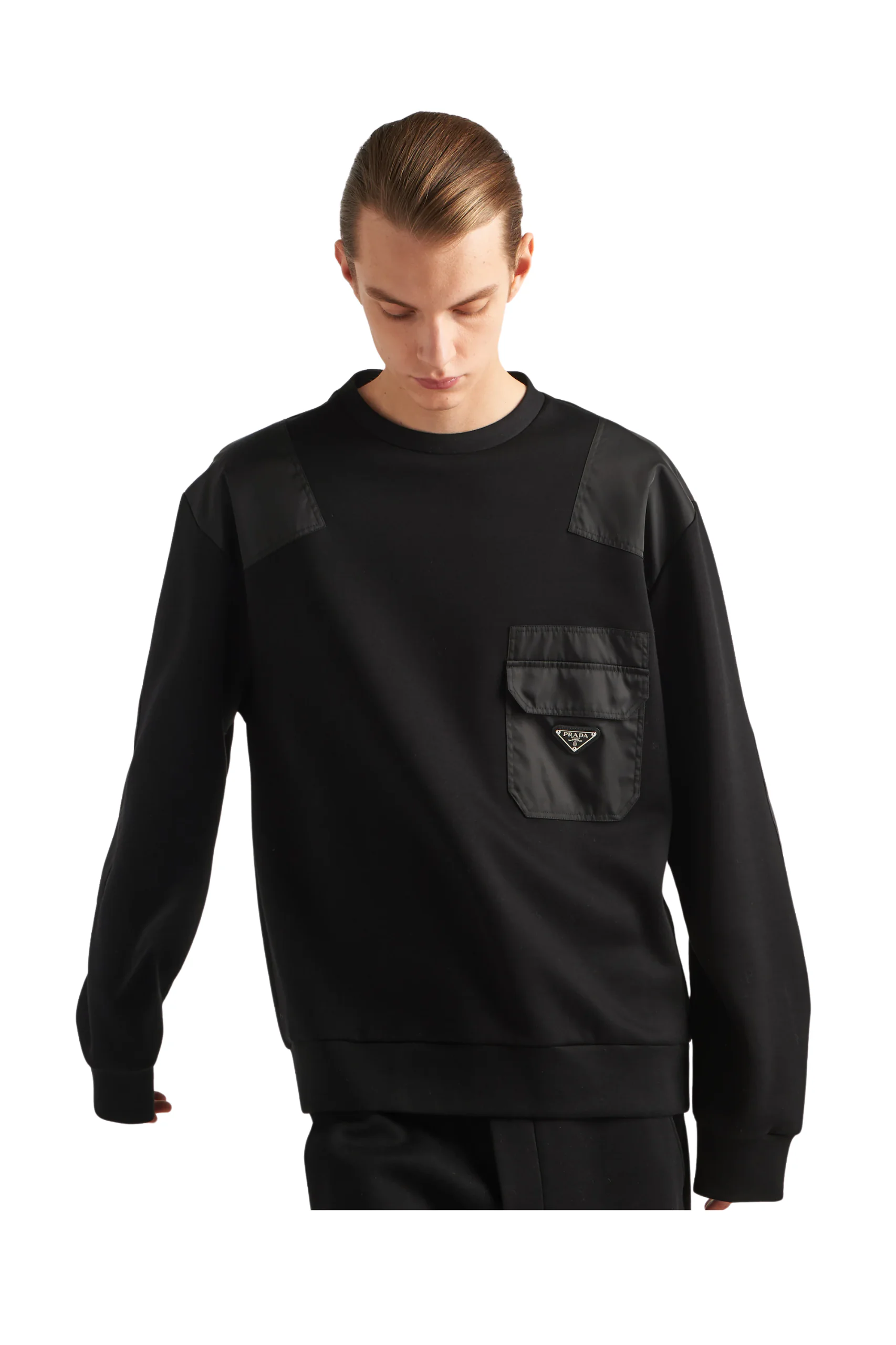 The cotton fleece sweatshirt with sporty elements and casual allure is enriched by details in Re-Nylon, the regenerated nylon fabric that is distinctive of Prada collections. The style with a relaxed fit is characterized by the classic crew-neck, while the appliqués and breast pocket introduce a refined, contemporary touch. The enameled metal triangle logo completes the look with its distinctive signature.