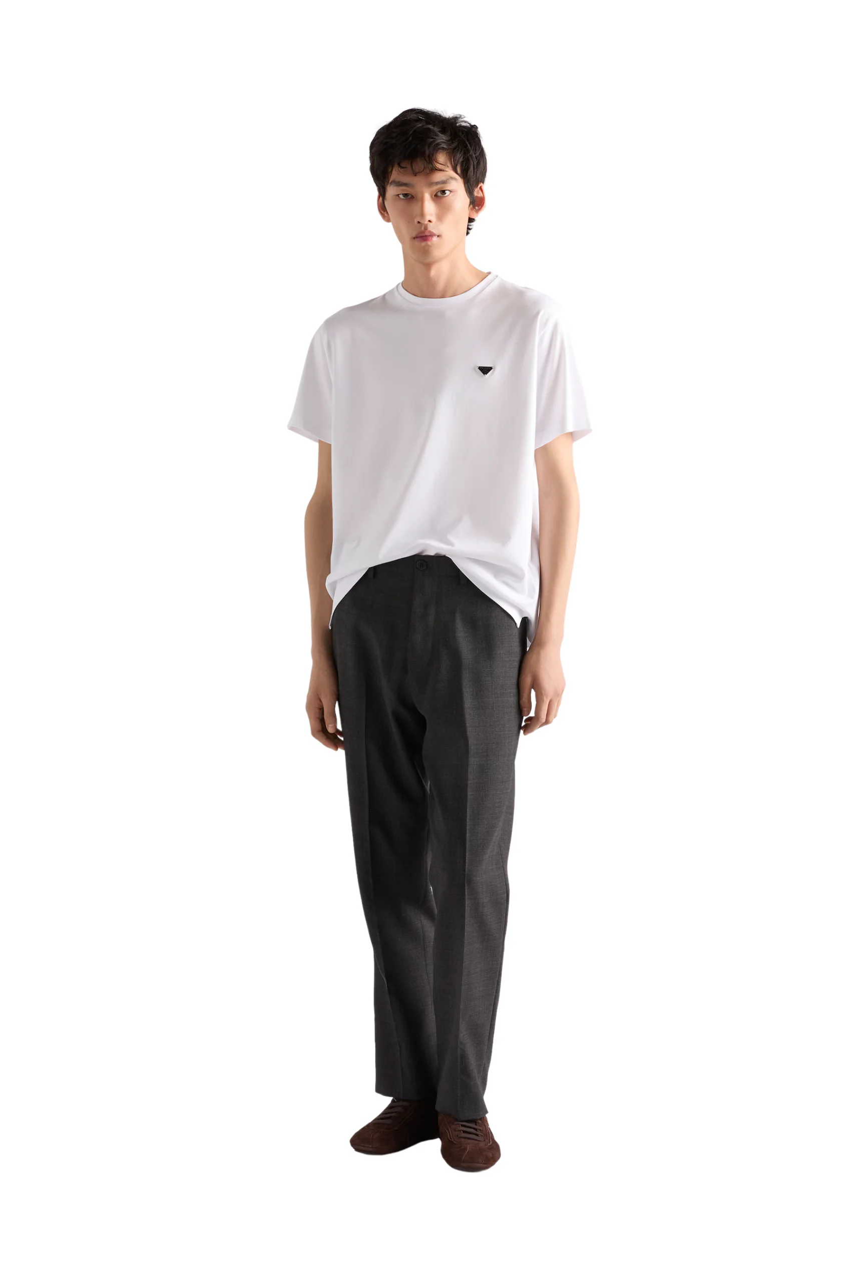 This soft cotton crew-neck t-shirt features a short-sleeved design with a boxy fit. The triangular metal enamel logo adds an iconic touch.